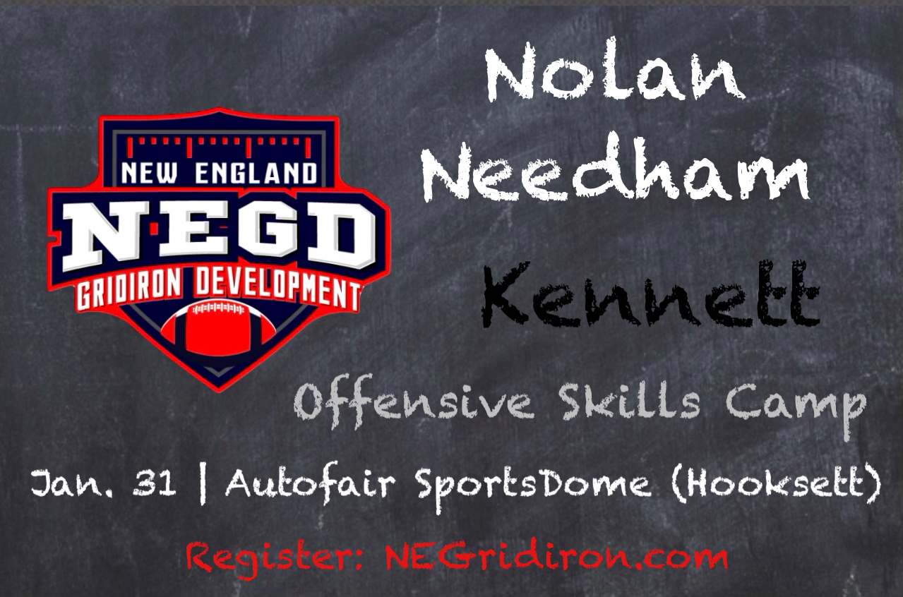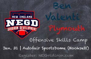 New England Gridiron Development will hold an Offensive Skills Camp on Jan. 31 from 1-3 p.m. at the Autofair SportsDome in Hooksett, N.H. This event is open to all offensive skill-position players (quarterbacks, wide receivers, running backs and tight ends) in grades 9-12.